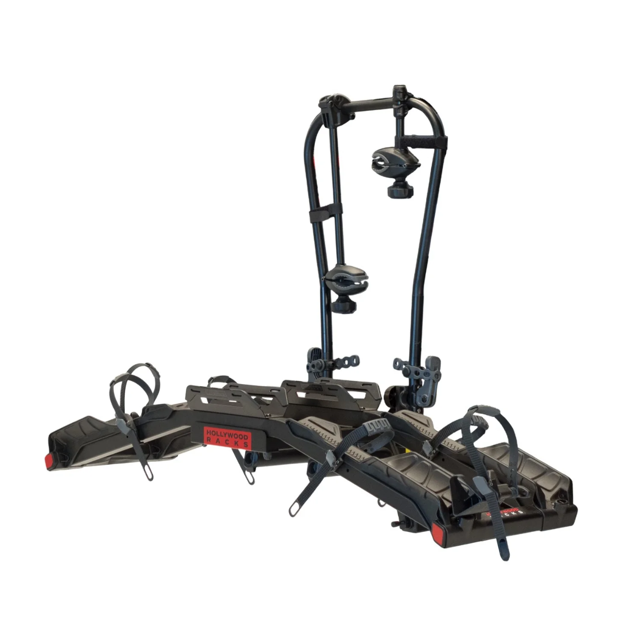 This durable, strong bike rack includes new universal extra heavy-duty wheel holders for heavy load carrying capacity. As with the Sport Rider SE, this hitch-mounted bike rack can fold flat against the car when not in use and can be tilted for easy access to the cargo area. Also includes a keyed-alike locking hitch pin, 8' security cable, and locking frame to keep your rack and bikes secure during travel. Features patented No Wobble-No Tools Hitch Tightening System. For 2" hitches only.